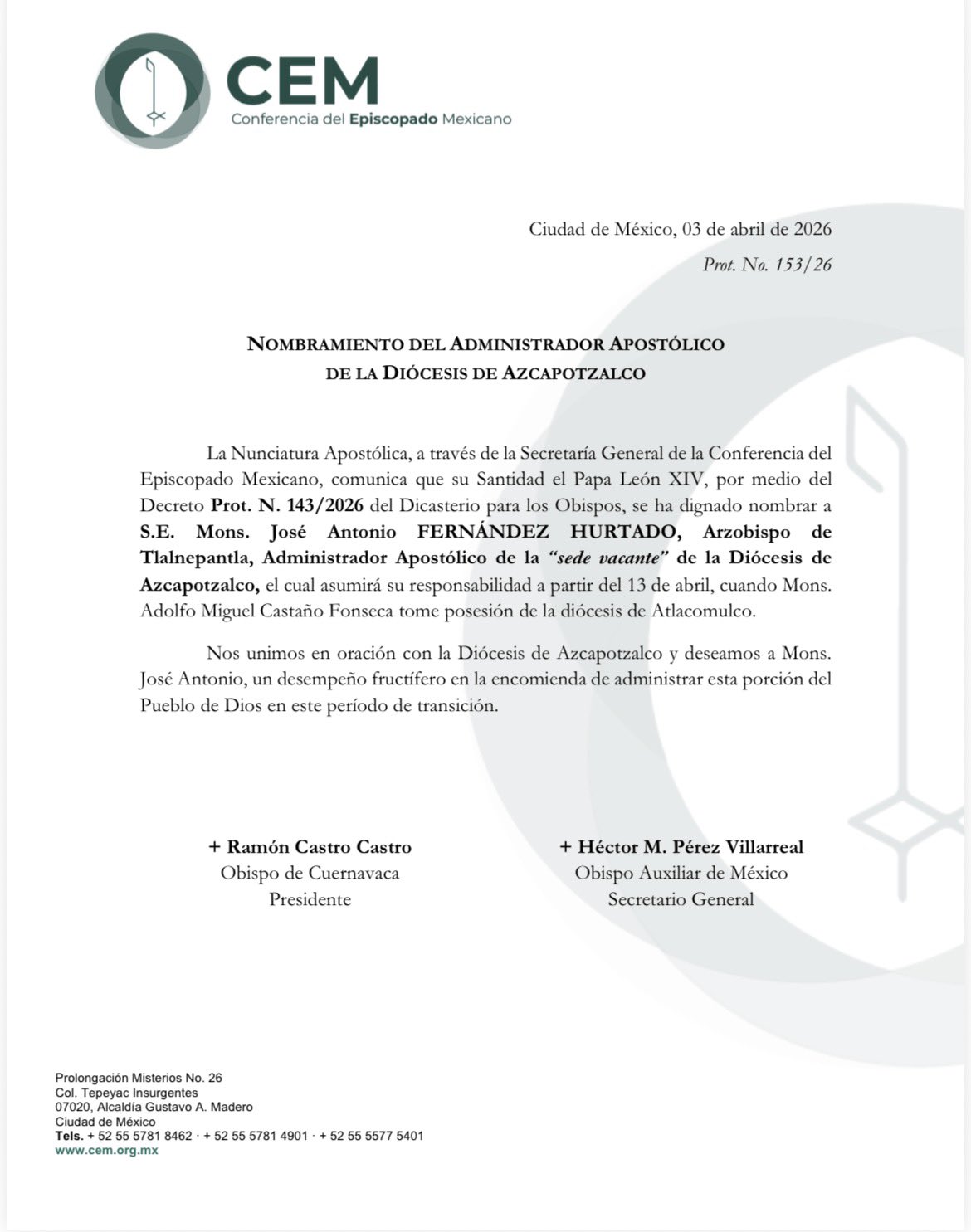 La Nunciatura Apostólica, a través de la Secretaría General de la Conferencia del Episcopado Mexicano, comunica que Su Santidad el Papa León XIV, por medio del Dicasterio para los Obispos, se ha dignado nombrar a S.E. Mons. José Antonio FERNÁNDEZ HURTADO, Administrador Apostólico de la “sede vacante” de la Diócesis de Azcapotzalco, el cual asumirá su responsabilidad a partir del 13 de abril, cuando Mons. Adolfo Miguel Castaño Fonseca tome posesión de la Diócesis de Atlacomulco.